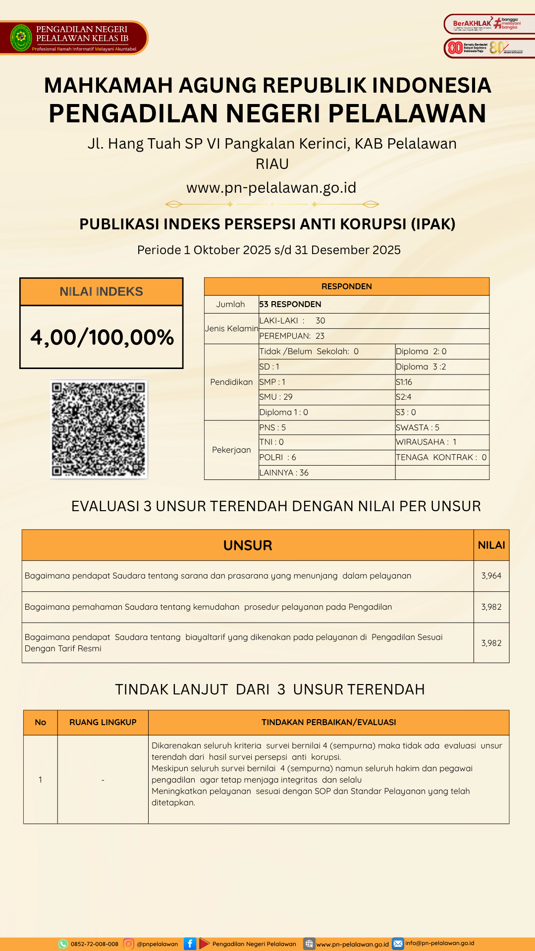 | Triwulan IV | Dikarenakan seluruh kriteria survei bernilai 4 (sempurna) maka tidak ada evaluasi unsur terendah dari hasil survei persepsi anti korupsi. Meskipun seluruh survei bernilai 4 (sempurna) namun seluruh hakim dan pegawai pengadilan agar tetap menjaga integritas dan selalu Meningkatkan pelayanan sesuai dengan SOP dan Standar Pelayanan yang telah ditetapkan. |